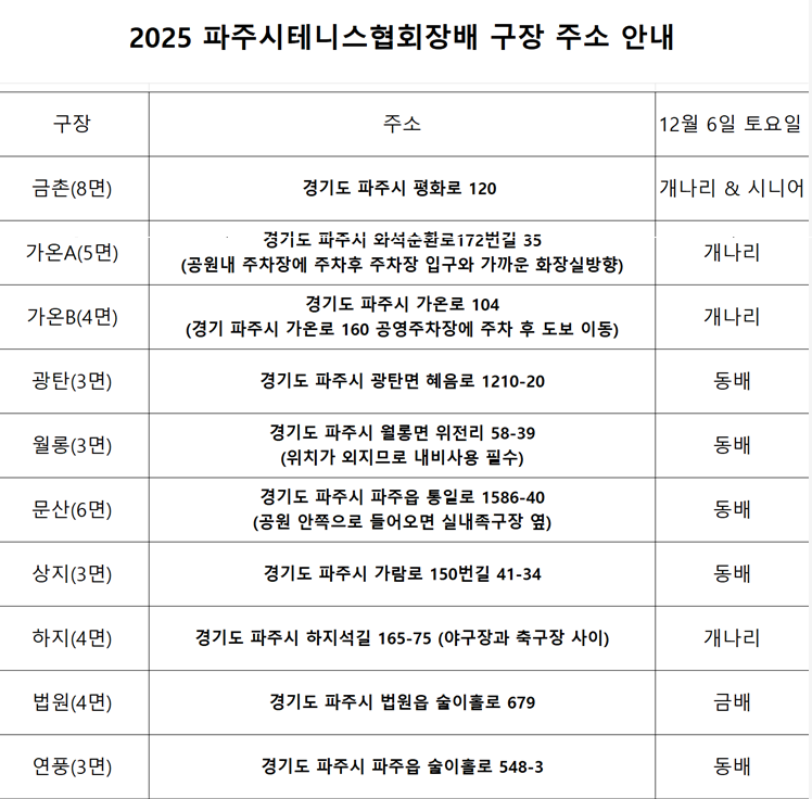 2025 파주시테니스협회장배 테니스대회 코트장 주소 안내