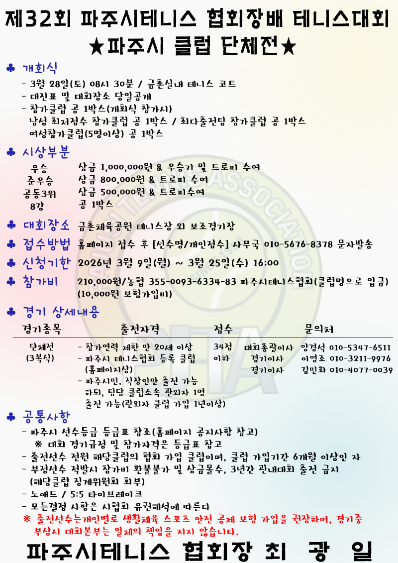 제32회 파주시테니스협회장배 테니스대회(파주시 클럽단체전) 포스터