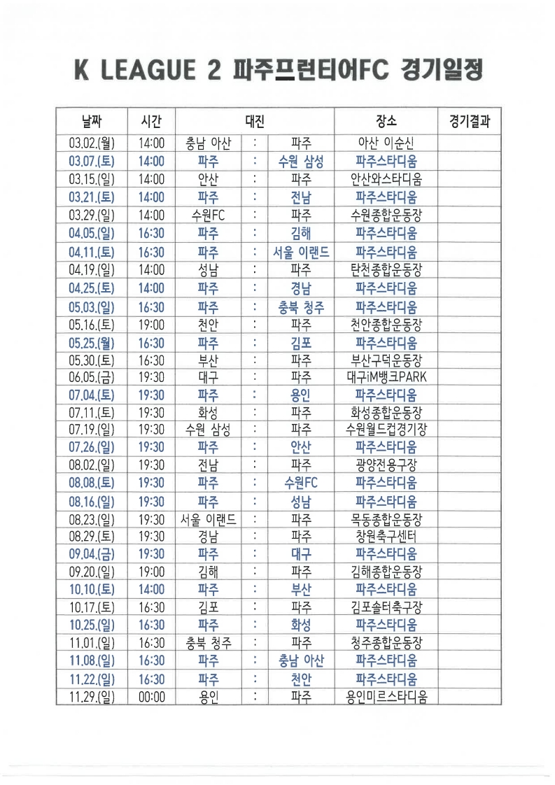 파주 공설 스타디움 구장 K리그2 파주프런티어 FC 홈경기 진행시 주차 통제로 인하여 코트 예약 불가 안내 드립니다.